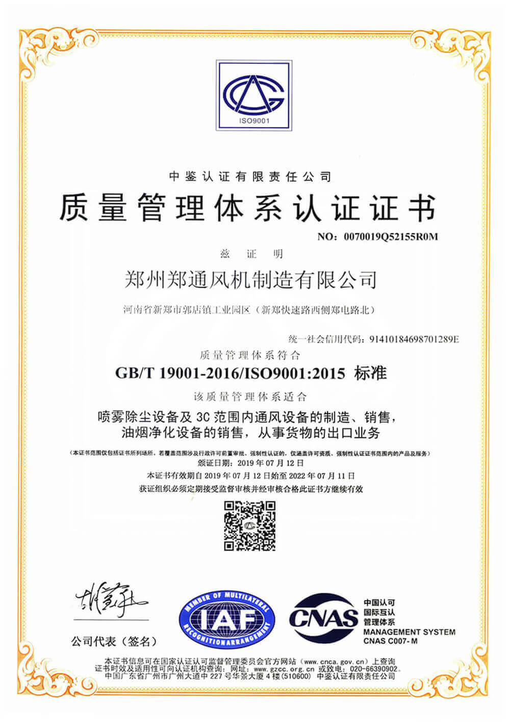 鄭通風機主要產品包括:高壓風機、不銹鋼風機、消防排煙風機、防腐防爆風機、廚房排油煙風機、玻璃鋼風機、鍋爐引風機、軸流風機、柜式離心風機、鍋爐引風機,產品通過ISO9001、ISO14001、ISO45001國際標準化組織制定的質量管理體系認證,部分產品通過了3C認證和國家防爆電器產品質量監督檢驗中心認證。